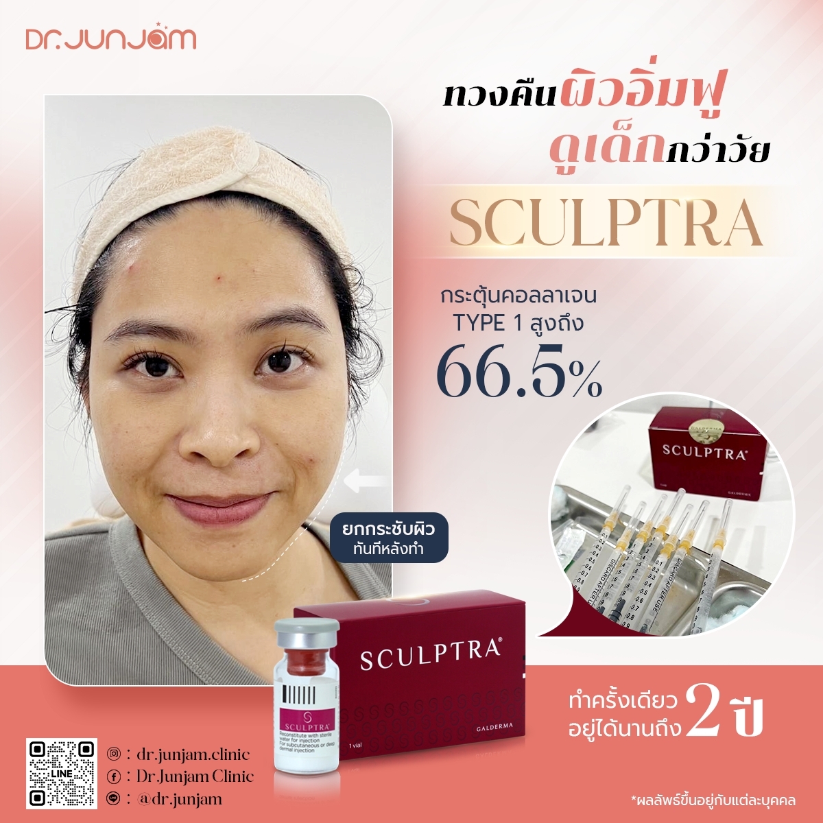 รู้หรือไม่ ❓ คอลลาเจนใต้ผิว พออายุ 25 ปีขึ้นไปเริ่มน้อยลงแล้วนะ เติมเต็มด้วย SCULPTRA กระตุ้นคอลลาเจน TYPE 1 สูงถึง 66.5% ยกกระชับผิว ทันทีหลังทำ ทำครั้งเดียว อยู่ได้นานถึง 2 ปี