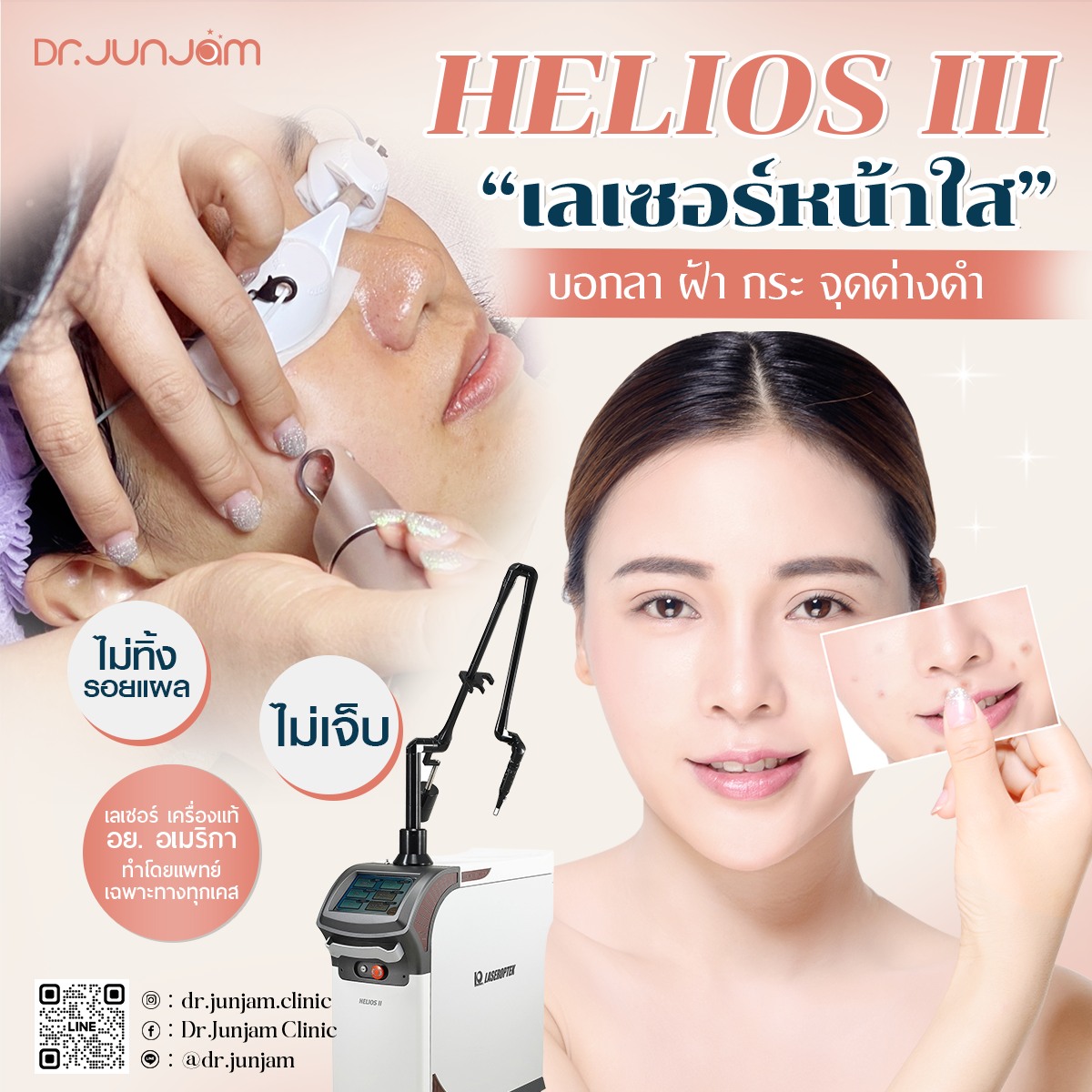 ลดรอยดำบนใบหน้า สีผิวสม่ำเสมอ ด้วยโปรแกรม HELIOS III LASER เลเซอร์รักษาฝ้า กระ จุดด่างดำ ไม่ทำให้หน้าบาง